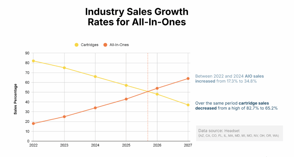 Right now, AIOs hold about 45% of vape sales nationally, flipping the 80/20 cartridge dominance from just three years ago. But, due to the wasteful one-and-done mentality that makes AIOs so convenient, that growth has come with heavy costs – to consumers’ wallets, to brand flexibility, and to our environment.